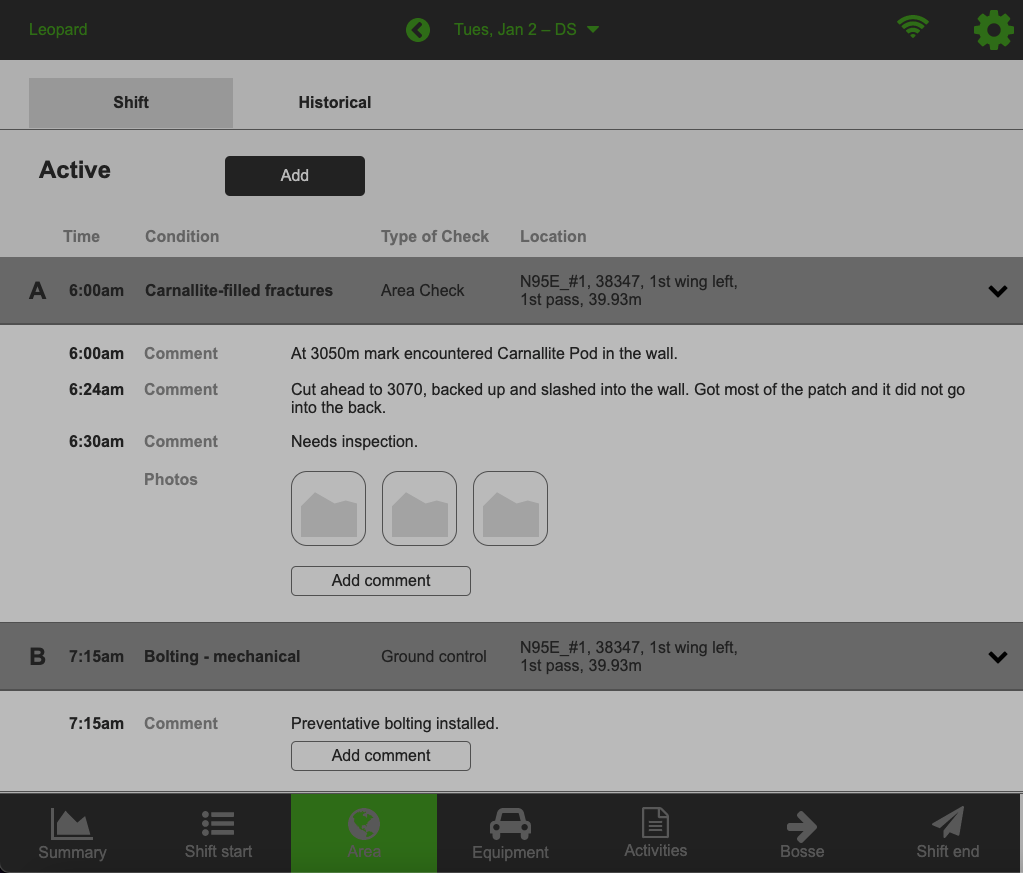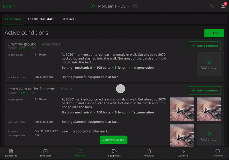 If a hazard was created on a previous shift, but remains active, a miner can add additional details. Collaborating on work started by another crew is possible. You can add ground control, photos, comments, and remediate the hazard.